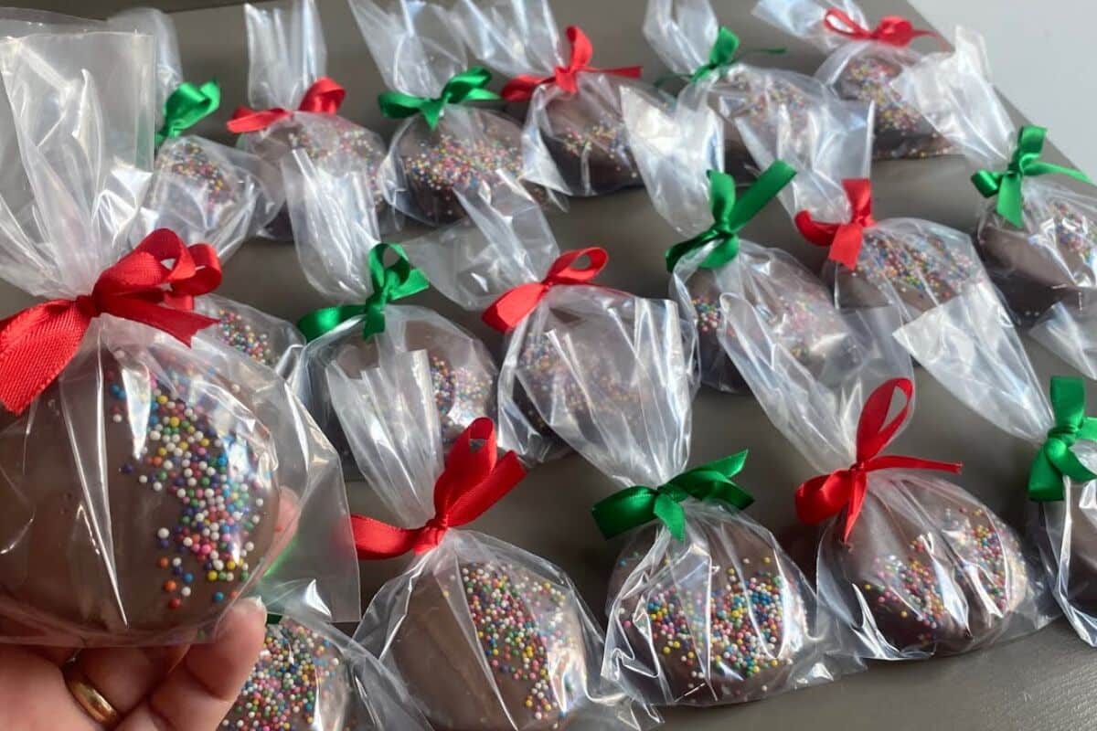 - Decore com chocolate granulado colorido, embrulhe-as em saquinhos de plástico e amarre com fitinhas vermelhas ou verdes fazendo um laço.