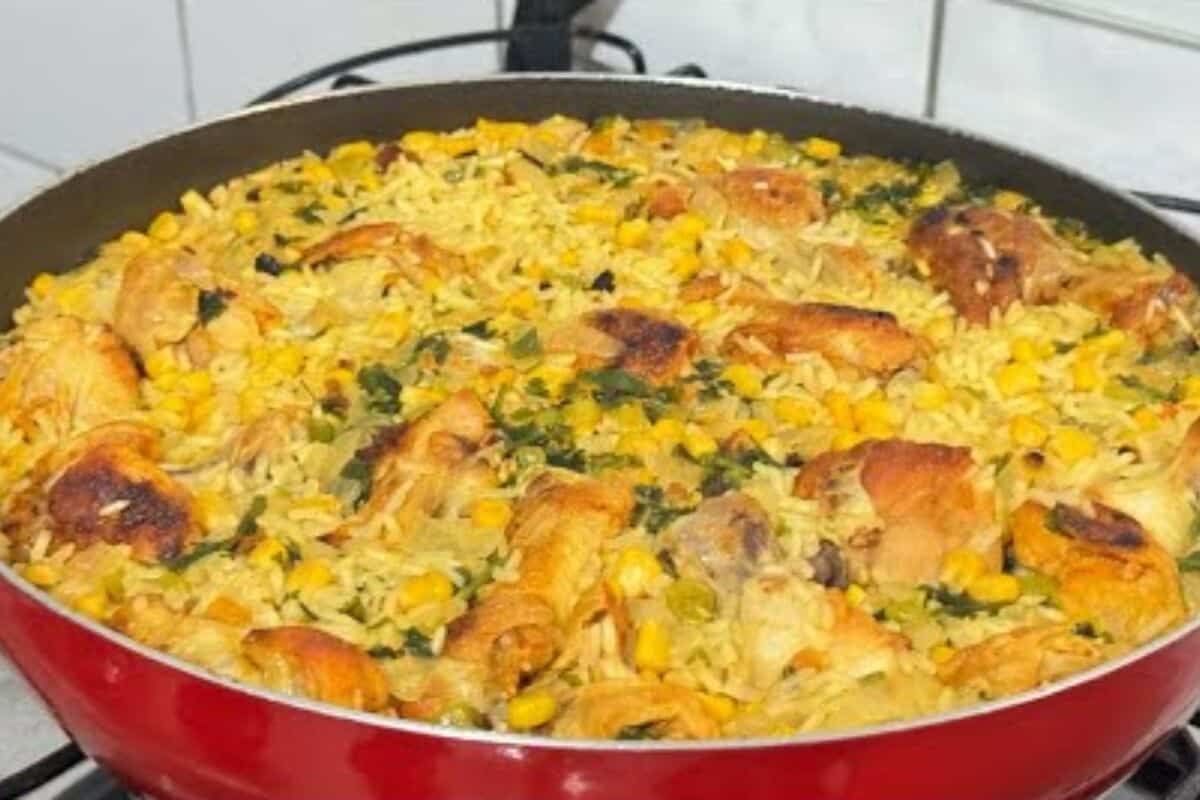 - Coloque o milho verde, o arroz cru e lavado, misture bem para incorporar, adicione água o quanto baste, ajuste o sal, tampe a panela e deixe cozinhar até o frango ficar macio e o arroz cozido.