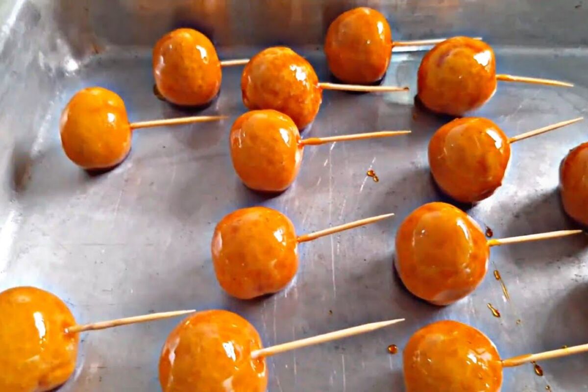 - Com um palito, pegue o docinho e mergulhe nessa calda, coloque para secar em uma forma e depois de seco retire os palitos das balas.