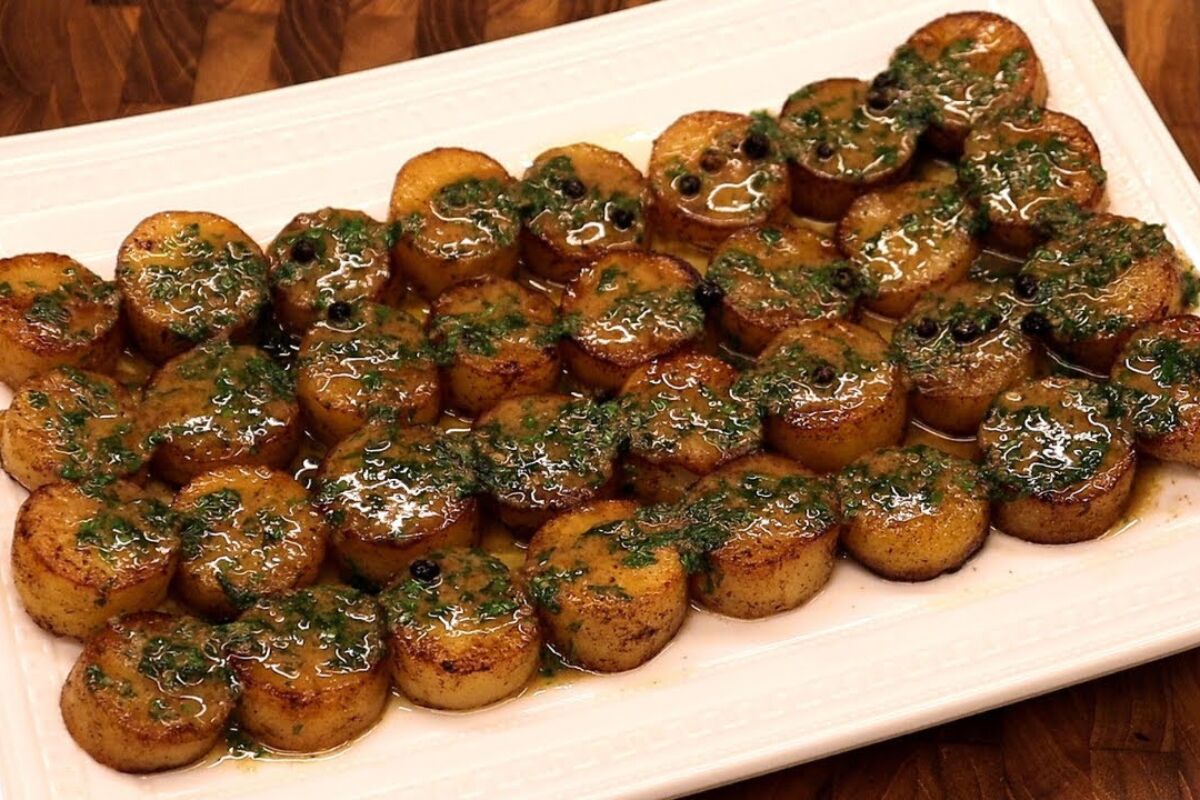 - Aqueça uma panela no fogo com ½ tablete de manteiga sem sal e antes que derreta por completo, acrescente os círculos de batatas, deixando cozinhar lentamente em fogo mínimo.