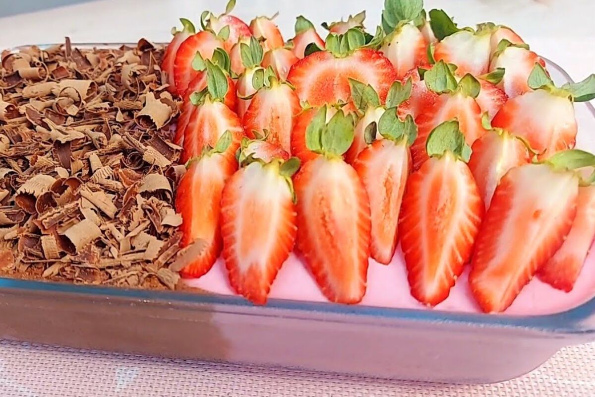 - Despeje num refratário retangular ( 30 cm x 20 cm) a mousse de morango numa metade, e na outra metade a mousse de chocolate.